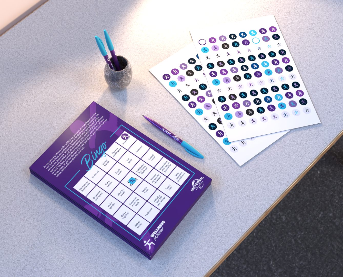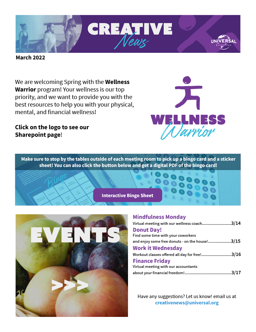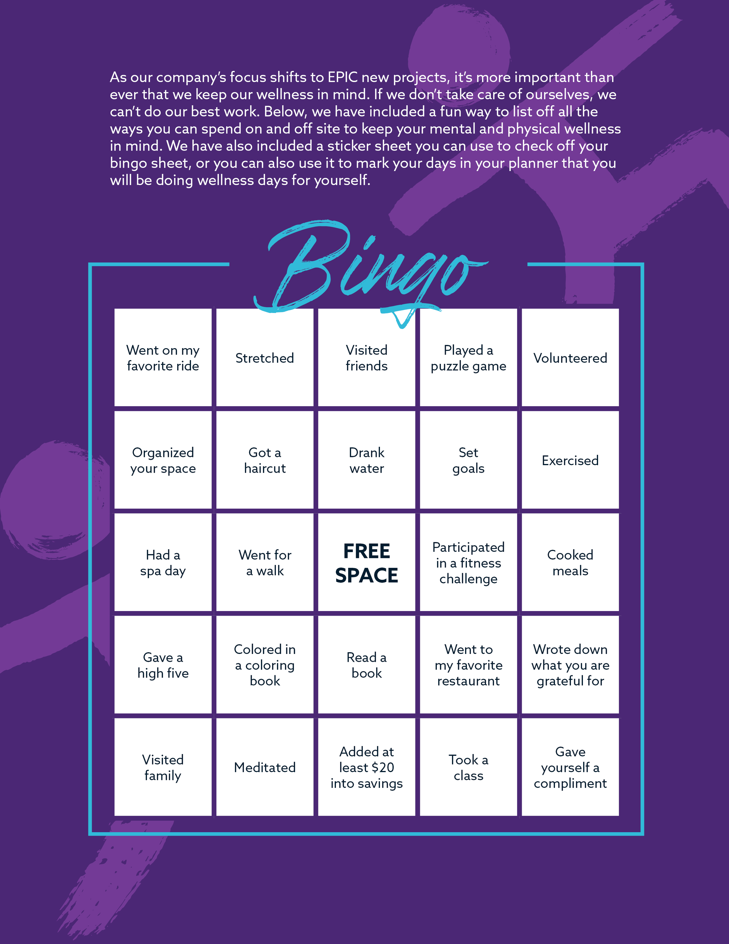 There are so many ways for someone to practice wellness for themselves, whether that be physical, mental, or financial, the possibilities seem to be endless. I wanted to provide an engaging activity for Universal Team Members to take part of. I came up with a bingo card and a sticker sheet that includes different ways for employees to be mindful of their bodies, minds, and money. The activities are written in past tense, so employees have the chance to “check off” each item on the list. I also invited the idea of using the stickers for this activity that can be used on the employee’s calendar or planners, so they can plan days ahead when they will be doing any of these activities.